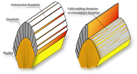 Linear structural features develop as the result of micro-folding and surfaces intersection. Fold rodding lineations, also called crenulation lineations, correspond to the hinge of micro-folds along bedding planes. Cleavage-bedding intersections are called intersection lineations. Those lineations can appear on both cleavage and bedding surfaces. Both type of lineation run parallel to the fold axis, they are used as a proxy for fold hinges. |